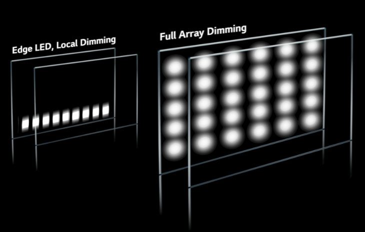 اصلاح بعدی برای نور پس زمینه LED، نور پس زمینه full array با Local dimming است که نور مستقیم LED را میشکند و آن را به چندین قسمت جدا میکند. هر یک از این قسمت ها بخشی از صفحه را روشن می کنند و بسته به محتوای آن بخش از صفحه نمایش، می توانند به صورت جداگانه روشن یا تاریک شوند.